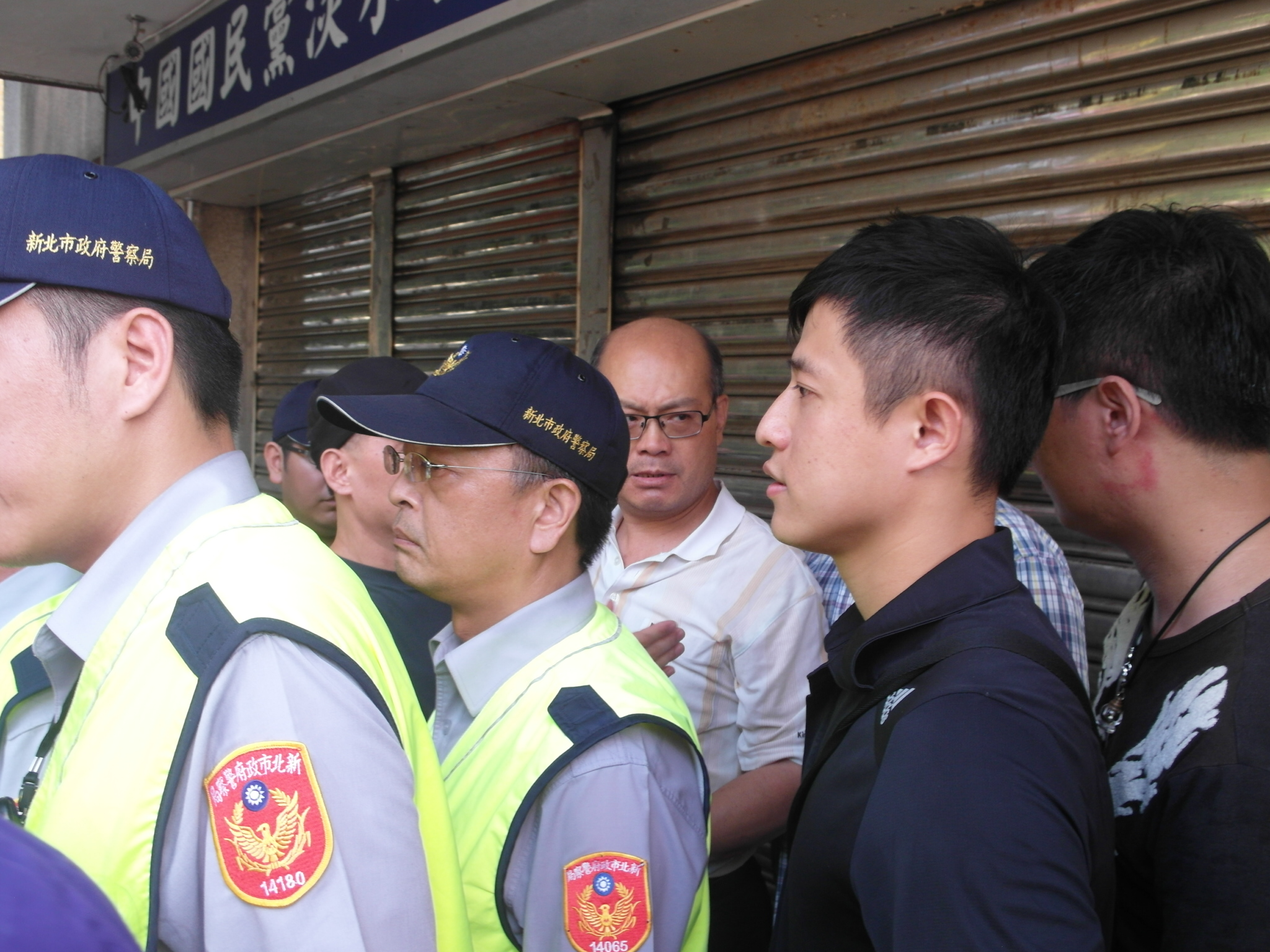 陳為廷本想繼續與這位黨工對話,但潘金輝仍自顧自地強調,國民黨的施政如何如何,不願意讓其他人發言提問,此時民眾再也忍不住地喊起「我要喝茶、我要服務」,警方也將黨工團團包圍,阻止他再發言。(如圖)