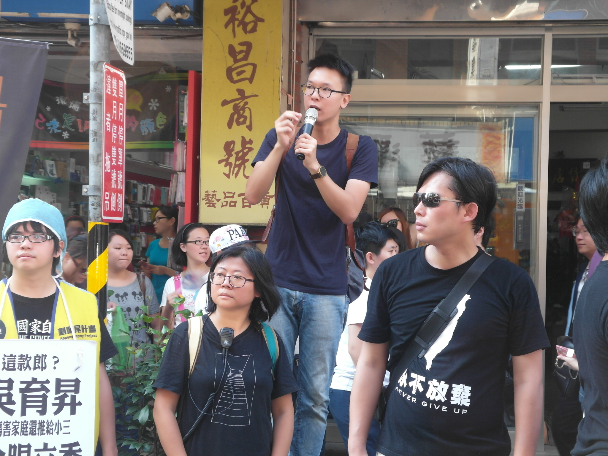 林飛帆說,許多人問,為何經過3、4月運動後還要上街,難道閒閒沒事幹嗎?「都是因為那些無恥政客,藍綠朝野都一樣」,沒有恪盡監督職責,當代議政治失靈時,觀察歐美民主國家,最好的「補足方式」就是公投,請大家支持公投補正及罷免案聯署,「沒有把他割掉,絕對不會放棄!」(左圖圖說:台大助理教授陳惠敏、318運動領袖林飛帆及中研院副研究員黃國昌(從左至右),及因遲到尚未出現的陳為廷,是島國前進的主要成員。記者陳淑貞攝)