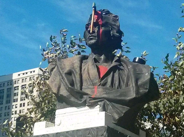 (位於美國底特律的一處哥倫布雕像,遭到小斧頭及潑漆侍候。截圖取自:Twitter/Independent US @IndyUSA )