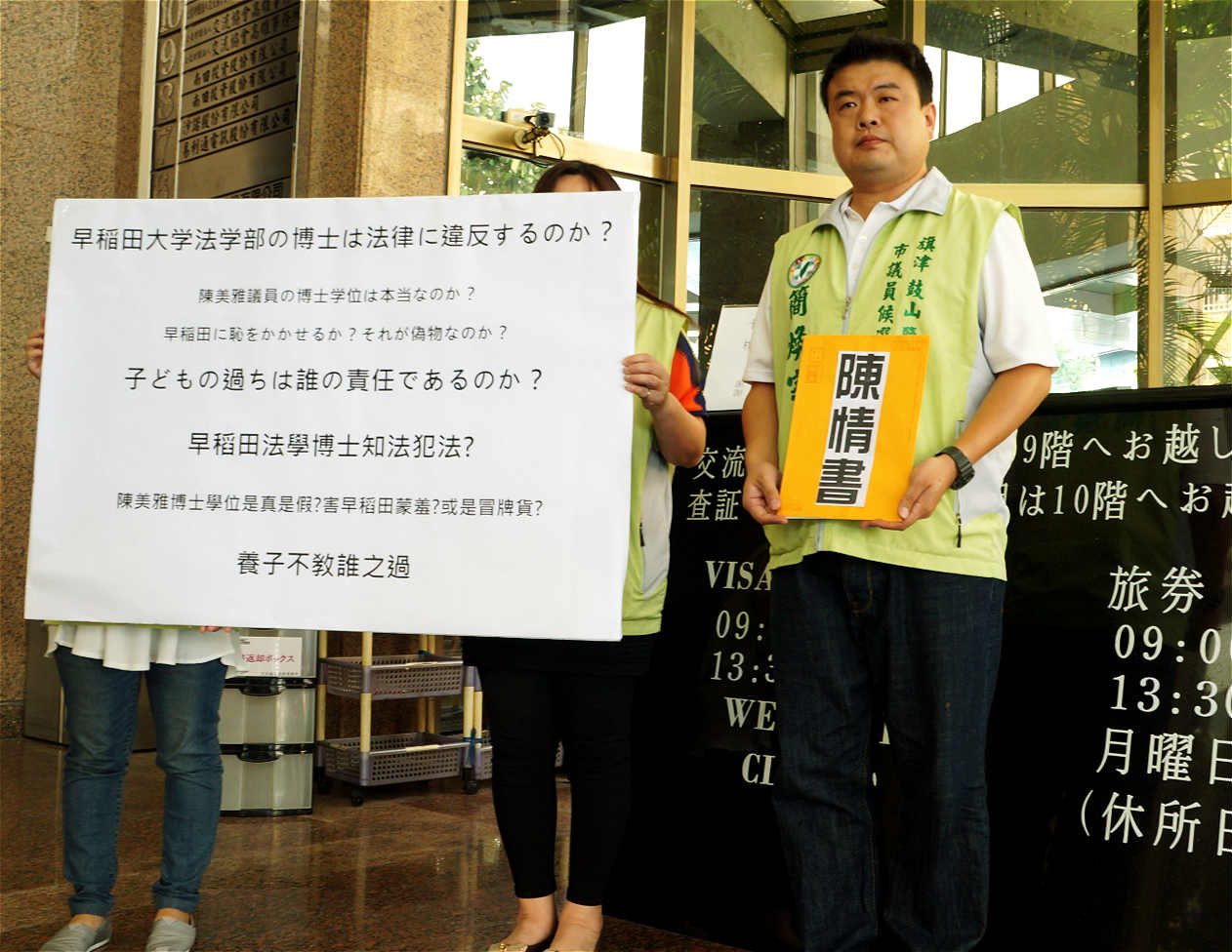 不過,簡煥宗也認為,早稻田大學是一所傳統嚴謹的學校,讓人不禁質疑陳美雅學歷的真實性,否則她以「法學博士」身分知法犯法的行為,跟本就是讓早稻田蒙羞!為了檢驗陳美雅的學歷真偽,簡昨天下午2時特別帶著中、日文陳情書書前往日本交流協會高雄事務所,希望協會協助查證她的學歷真偽。