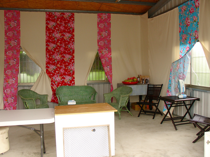 這幾年,我們選擇性地用手拔除太強勢的咸豐草,種上蔓花生,逐漸地,青草建立了自己的生態,形成四季多樣的綠色景觀。我們花了一些時間,把赤裸裸鋼骨與蔗板的鐵皮屋內面用客家花布遮蓋,從鐵窗看出去,可以說服自己稍微美了一點。但夏天太酷熱了,我們只仿效棗農們開門接待採棗客人一季,就決定關門大吉,不解農人為何非得在不舒適的環境下刻苦著。