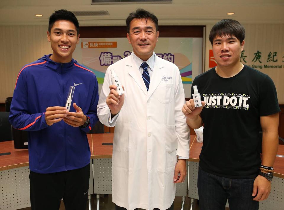 長庚醫院大力支持里約奧運醫療團及防疫包,為選手「護持」。田徑標槍選手黃士峰(下圖右)、