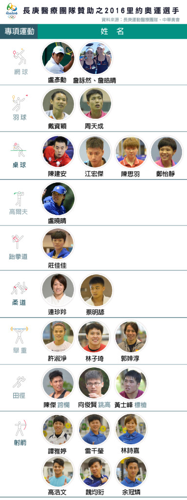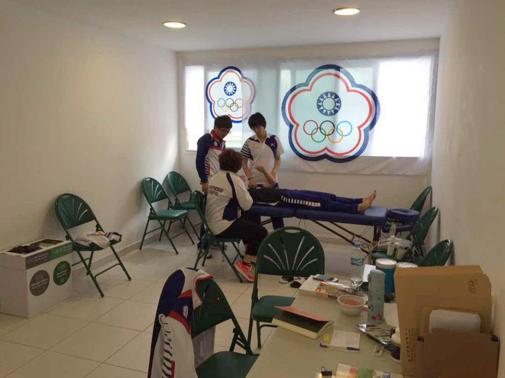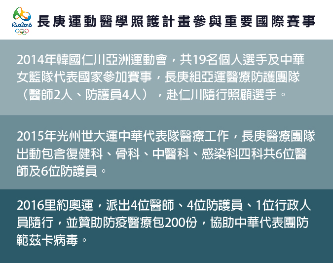 本屆里約奧運,長庚醫療團隊出動4位醫師、4位防護師(員)、1位行政人員全程隨行照護,其中國家負擔機票的是2位醫師、1位防護員,進駐選手村醫務站;另2位醫師、3名防護員加1位行政人員,則是由長庚自費在選手村外租用飯店「開外掛」、增設第二醫療站,並由國訓中心及隊醫商借2張治療床運送至里約。