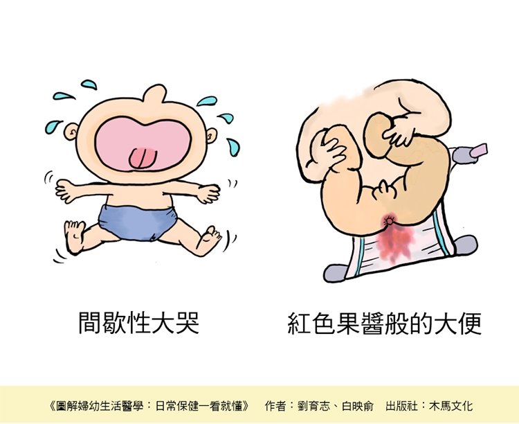 嘔吐、腹痛、血便、腹部腫塊是最常見的幾種症狀,但是並非所有的患者都會如此完整的表現。父母親要提高警覺,若有懷疑便要請教兒科醫師,評估是否需要進一步的檢查。