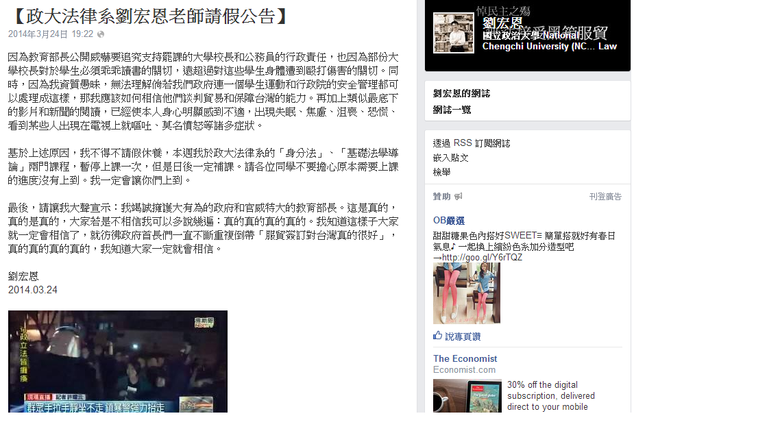 曾在臉書上發表「媽寶、爹寶不要來」的政大法律系教授劉宏恩,24日晚在臉張貼一篇請假公告表示,「因為教育部長公開威嚇要追究支持罷課的大學校長和公務員的行政責任,也因為部份大學校長對於學生必須乖乖讀書的關切,遠超過對這些學生身體遭到毆打傷害的關切」,加上看了最近的新聞,「身心明顯感到不適」,因此本周兩門課程停課一次,日後一定補課。