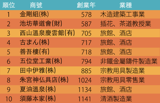 調查顯示,日本143萬家企業商號平均壽命35.6年;許多企業動輒創業於江戶時代、明治時代,甚至登上《金氏紀錄》世界最悠久企業的營造業「金剛組」,是創業於西元578年的飛鳥時代,亦即1400多年歷史,超過奈良的法隆寺、大阪難波的四天王寺等;其他也有1300多年的北陸旅館「法師」,或1200多年的京都和菓子「黑川虎屋」等;不僅傳統企業,像手機畫面或內部心臟零件等尖端科技,有許多是日本百年企業的結晶。