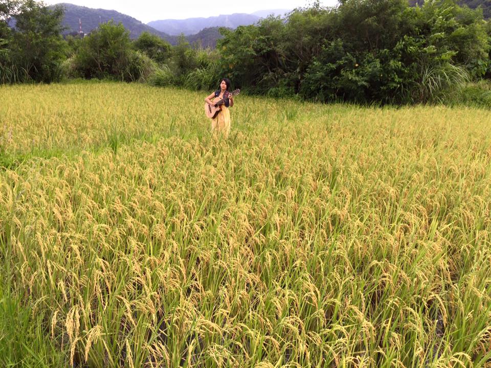 稻田裡的以莉.高露,和身兼音樂製作人的先生冠宇過著有田耕、有飯吃、便有歌唱的日子。(取材自以莉.高露臉書)