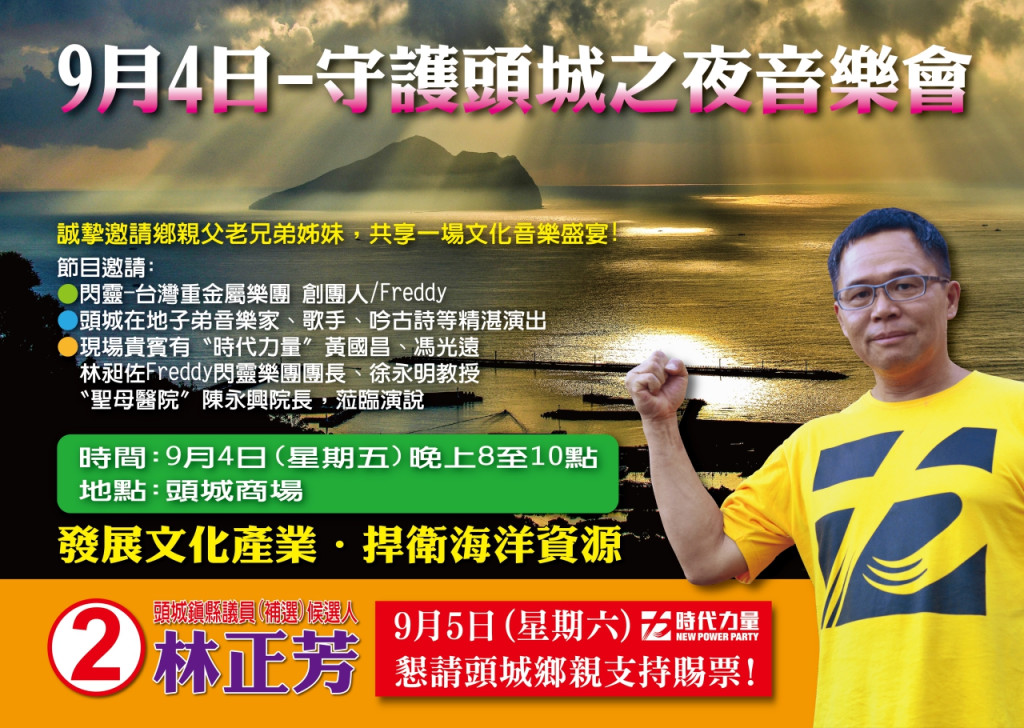 投票前一晚的9月4日「選前之夜」,包括該黨立委參選人黃國昌、林昶佐(Freddy)、徐永明,以及羅東聖母醫院院長陳永興醫師等人也將到頭城參與音樂會,力挺林正芳,全力營造勝選氣勢。「我們希望年輕人能回鄉踴躍投票,大家一起來改變地方選舉的文化,這是一場音樂的饗宴,希望大家開心」,林正芳如此表示。