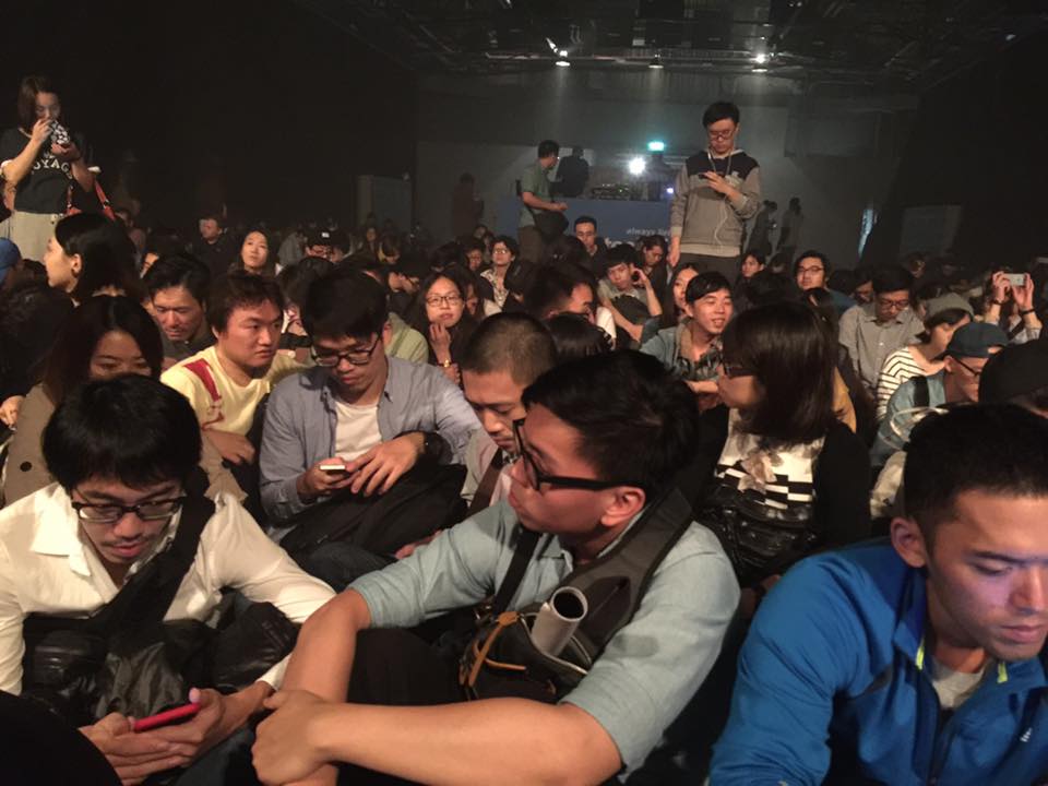 華山藝文特區冰島藝人場內演出,因場外音響強碰而延後兩小時才登台,大批觀眾坐在場外等待進場。(讀者巴度提供)
