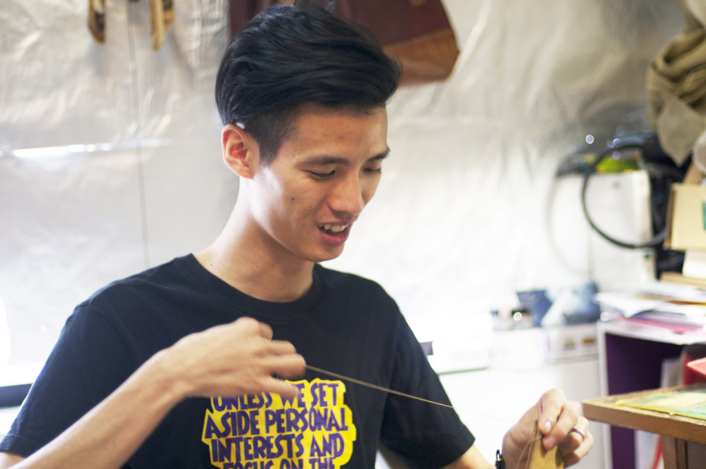 (From one老闆兼匠師唐琮壹,邊受訪邊縫,很是熟練。)