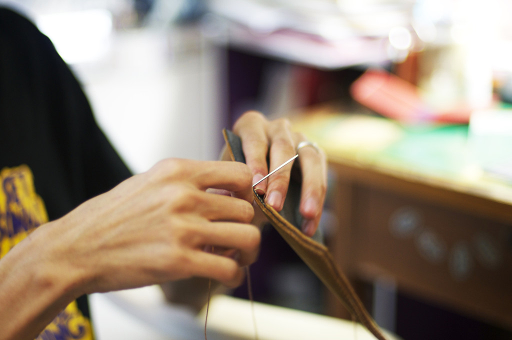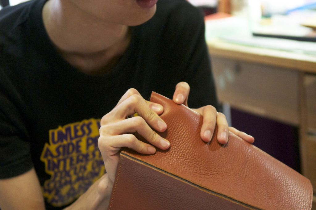 或者說,他追求的皮,要能吸納「人味」。外面打著「手工」名號,卻是為求效率,將生產者與工作異化到只剩幾個相同動作不斷重複,產品沒有絲毫偏差,但他不認為那是完美。從頭到尾一針一線手縫完成,因為「人」的缺陷,才獨特而有味道,才擁有靈魂,「缺陷」反是一種完美,而人不斷去修正缺陷所達到的精緻,又是另一個境界了。