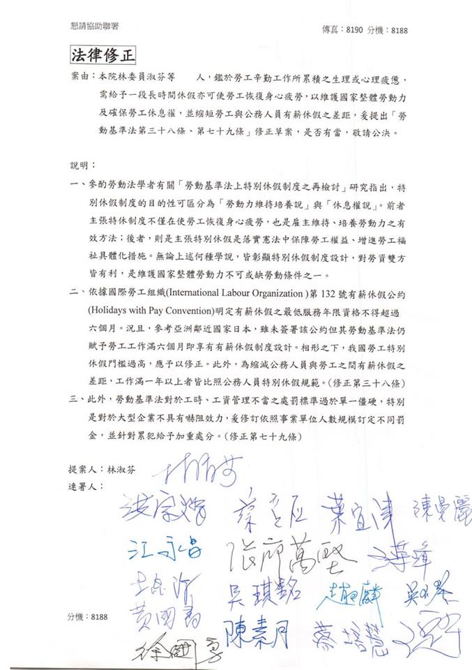 下圖:綠委林淑芬提案修正勞基法,將年假門檻改為滿6個月,多位立委連署。(圖/取自林淑芬臉書)
