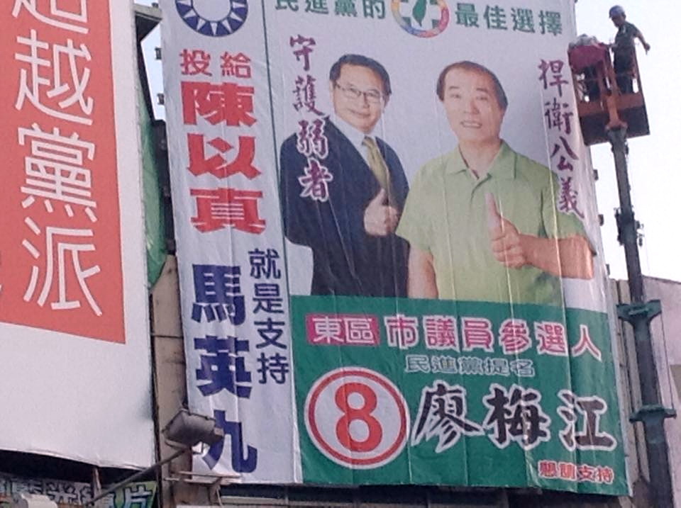 位在嘉義民主地標中央噴水圓環附近大樓的「國民黨徽:投給陳以真就是支持馬英九」看板,因餅舖店家礙於「壓力」,讓出資懸掛者被迫撤掉,今11月6日(四)上午,由律師嚴庚辰出資的「投給陳以真就是支持馬英九」看板,又再度掛上噴水圓環另一棟大樓。民進黨嘉義市長候選人涂醒哲與執行總幹事許世杰、青年火大聯盟召集人曾琮凱等在噴水圓環抗議嘉義民主聖地的言論自由被打壓。涂醒哲競選總部執行秘書的曾琮愷表示,未來看板如果再有任何施壓或者關切,將會訴諸法律行動。