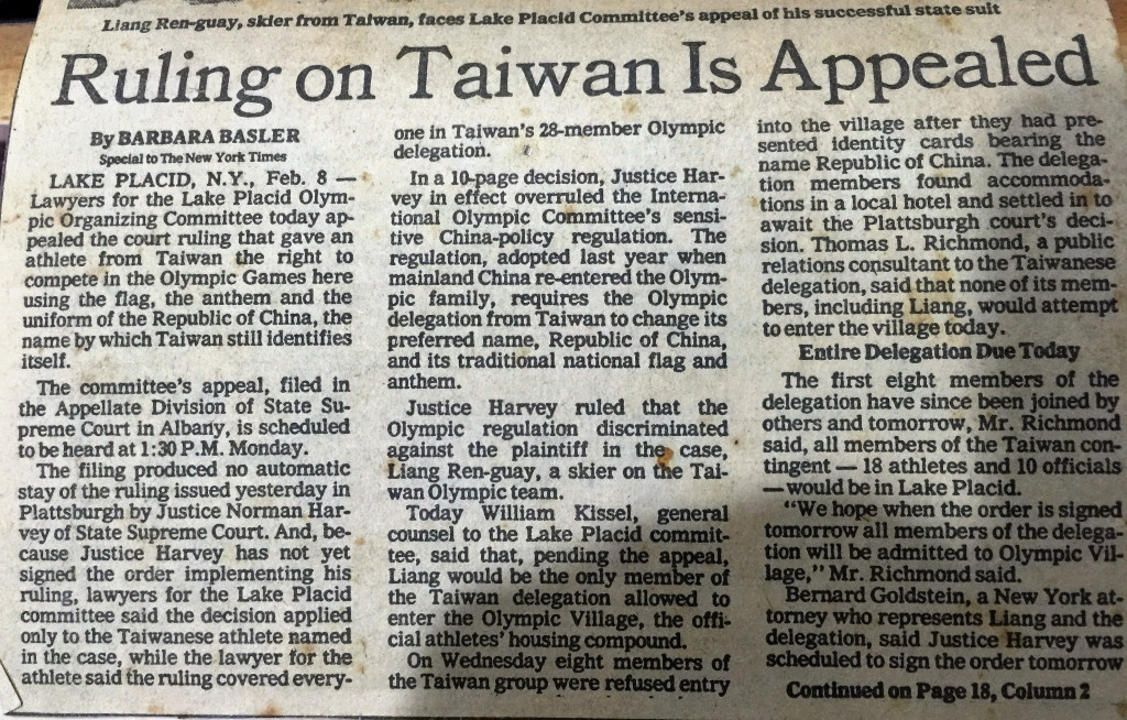 當屆越野滑雪選手梁仁貴氣憤之下,以個人名義向美國紐約州寧靜湖地方法院,控告冬奧籌備委員會,歧視我代表團;當時奧林匹克憲章明文規定禁止任何形式的歧視,對於國家奧會使用國旗國歌,也有條文規定,因此梁一審獲勝,中國不滿提上訴,後因「洛桑協議」簽定,「中華台北奧會模式」底定,此案未再發展。