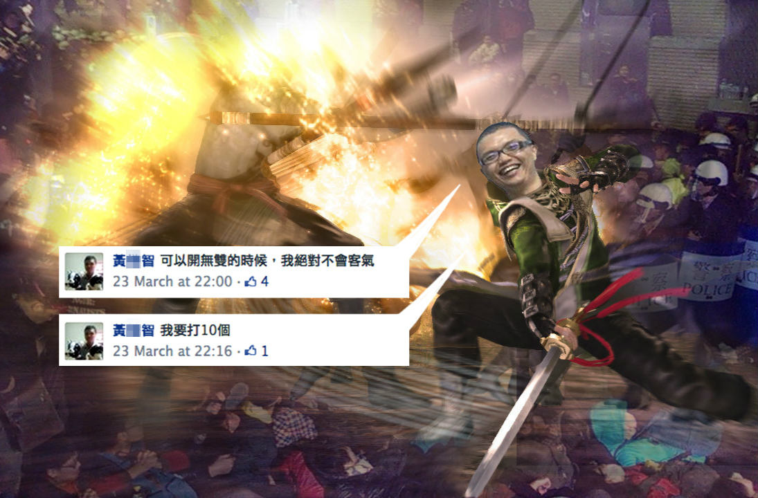警察殺紅眼,視百姓為芻狗!?又發現一黃姓惡警在自己臉書上嗆聲要對佔領行政院的抗議群眾「開無雙」!臉書上留言的友人甚至還火上加油:打大力一點…,這位惡警則回以「我絕對不會客氣」「我要打10個」!