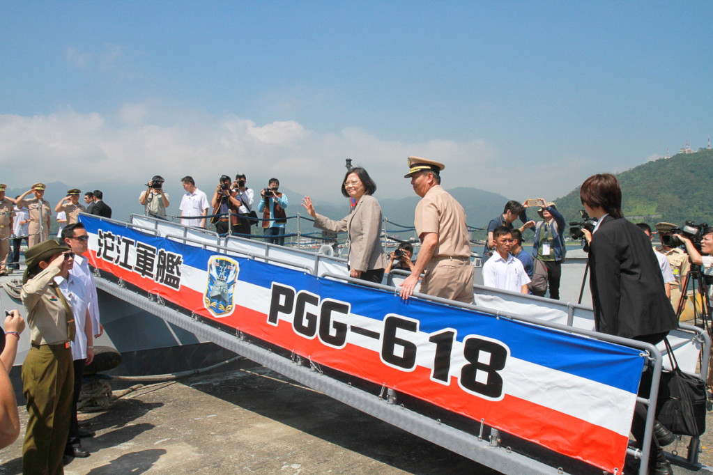 總統蔡英文搭乘「沱江號」出海短程巡弋20分鐘。出航時艦艉升國旗與統帥旗。