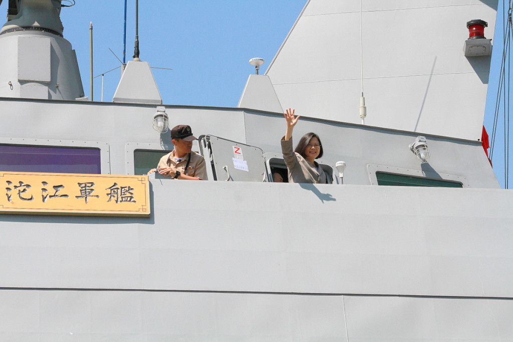 總統蔡英文登上新銳戰艦「沱江號」後,現身左舷向媒體揮手。(何豪毅攝)