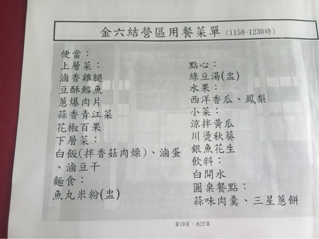 蔡總統與金六結營區官兵共進午餐,這是菜單(朱蒲青攝)
