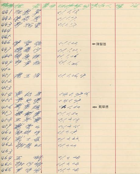 陳智雄烈士在調查局的《人犯編號登記簿》,被編為446號,1962年1月22被收押。同一頁竟然看見我的姊夫戴華德,編號456號,1962年1月30被收押。第454和455號分別是黃紀男和廖史豪,攏是早期重要的台獨運動者,攏早一日在1月29被收押。廖史豪是廖文毅的侄子。