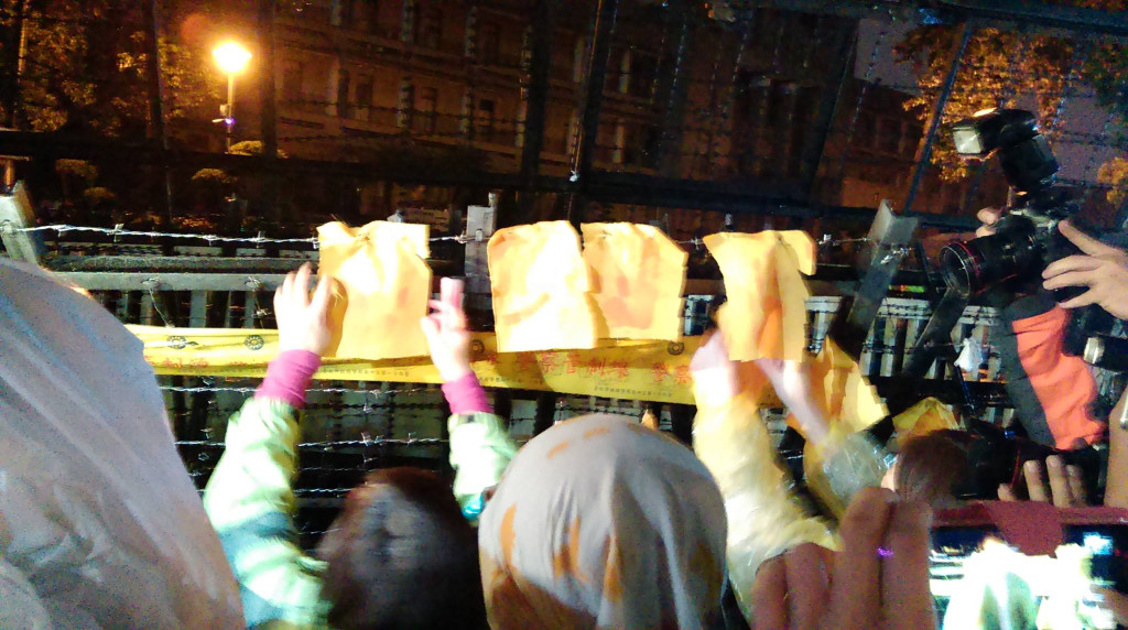 行政院血腥鎮壓今天屆滿周年,黑色島國青年陣線等團體近600人,今晚在雨中手持蠟燭走回「無光的所在。默哀三二三」,從青島東路晚會現場出發,走向事發現場行政院,將血手印掛在行政院,表達憤怒與控訴!