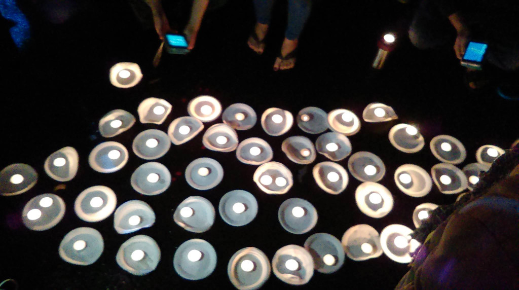 政院血腥鎮壓週年,民眾今晚在雨中走向事發地,用蠟燭在地上排出台灣形狀,為台灣祈福
