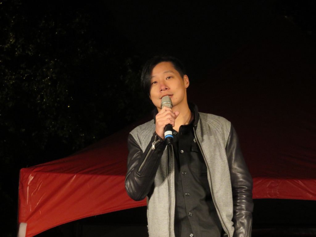 黑島青等團體今晚在雨中,手持蠟燭走回「無光的所在。默哀三二三」