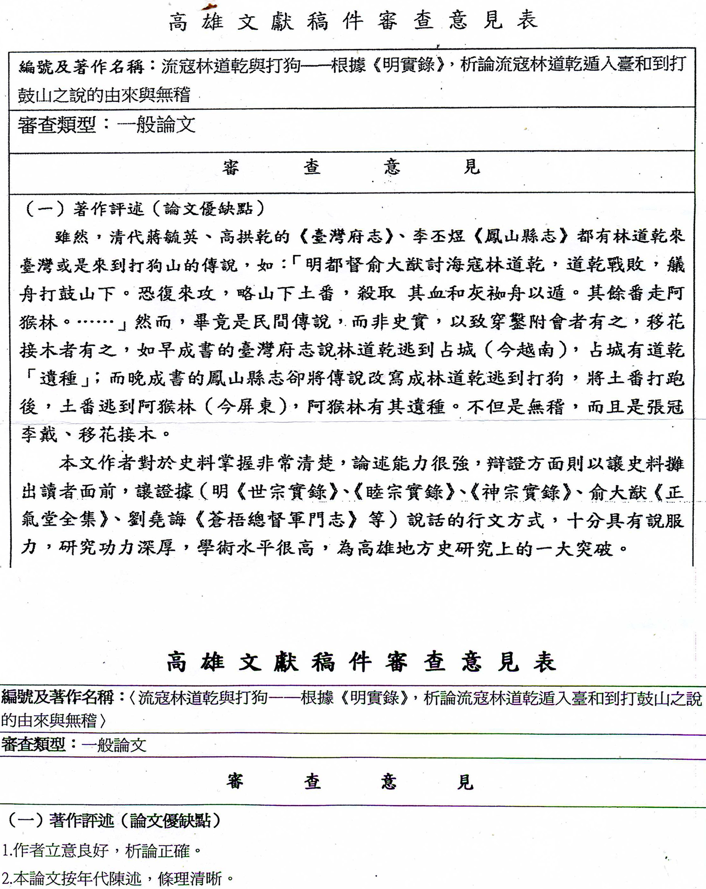 高雄市歷史博物館長王文翠指出,該論文經嚴謹審查認為析論正確,論文舉證按年代陳述、條理清晰是高雄地方史研究上的一大突破,惟是否是正確台灣歷史,仍須史學家未來持續共同探討。圖:高雄文獻(論文)稿件審查意見表。(呂自揚提供)