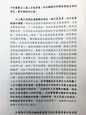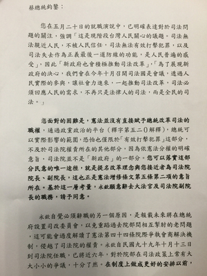 他說,蔡總統面對的困難,是《憲法》沒直接賦予總統改革司法職權,通過政黨政治平台(釋字第五二○解釋),總統可實際影響範圍恐怕僅限於「有效打擊犯罪」部分,不及於司法院權責所在的其他部分,依憲法分權明確意旨,司法院不是「新政府」一部分(意即司法無須隨政黨輪替)。