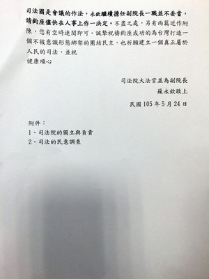 不過他也指出,司法院長賴浩敏在上任後就立即推動「全民司改列車」,此舉與蔡總統的「司法國是會議」本意相去不遠。