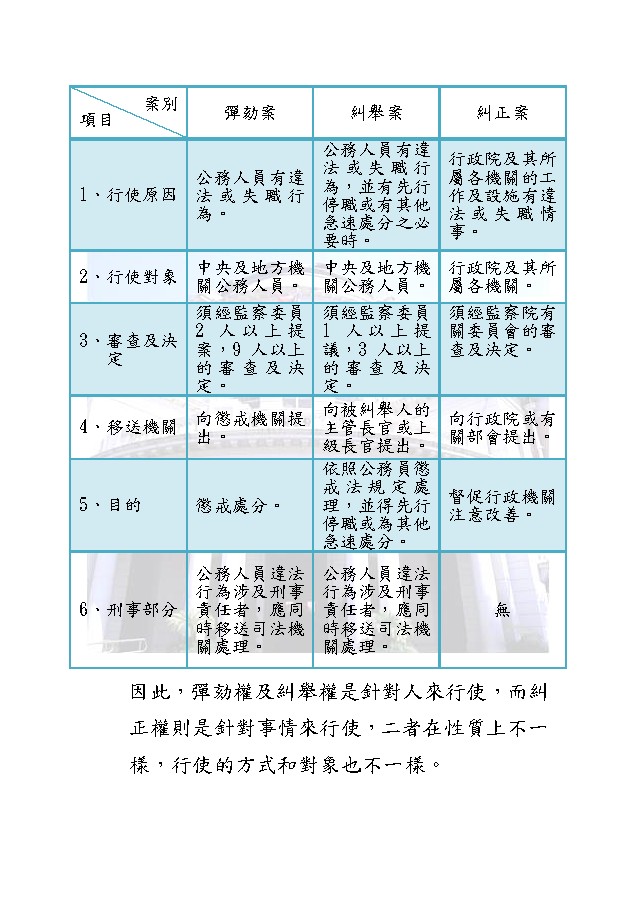 煎茶、啊,監察院可行使的三種權力叫做彈劾權、糾舉權及糾正權,強度以彈劾最強、糾正最輕;又,彈劾與糾舉是針對人來行使,糾正為針對事情來行使,實際作用就只有「督促行政機關注意改善」,就這樣,沒了。(詳細見圖)