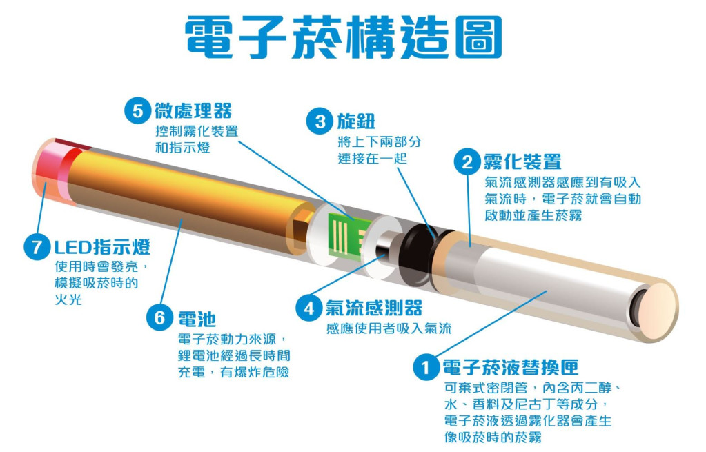 電子菸就是將尼古丁、丙二醇和其他化學品與重金屬等毒素所組成的化學混合物進行汽化。(圖片/董氏基金會 提供)