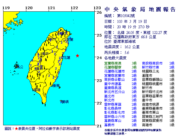 晚間許多人正坐在電視機前,關心反服貿黑箱民眾攻佔立院將近24小時的情況,突然一陣天搖地動,持續約7、8秒。中央氣象局表示,這場芮氏規模5.6的地震,發生在晚間8點19分27秒,震央是在花蓮縣政府東方66.8公里,地下16.2公里的海域的淺層地震。