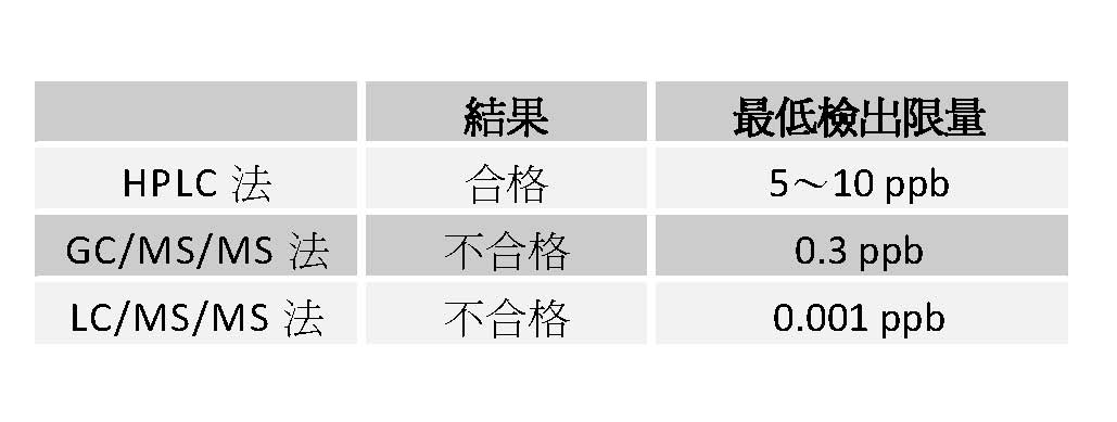 在此所謂「合格」,應該公布其檢驗方法及其依據判定標準,以釋眾疑。茲舉例說明如下,例如某一樣品的氯黴素之殘留量為1ppb,利用粗略的分析法(HPLC法)與精密分析法(GC/MS/MS法)或更精密的分析法(LC/MS/MS法)之結果不同如下表。