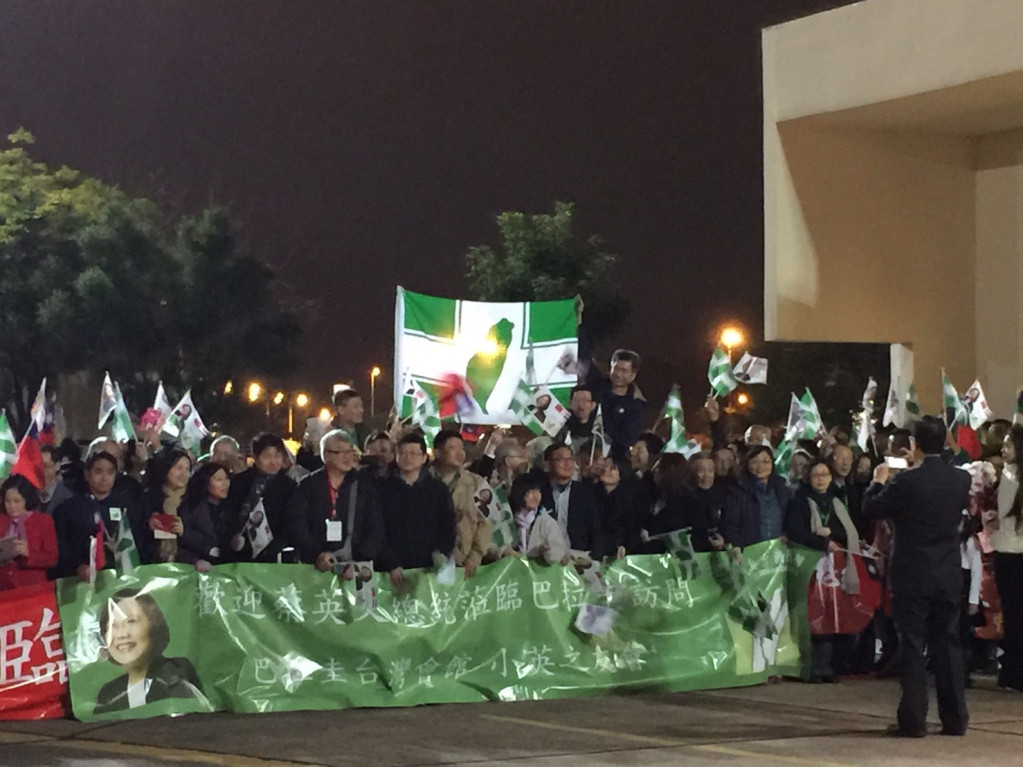 和接近赤道(北緯9度)、兩邊靠海的巴拿馬不同,巴拉圭是一個內陸國家(南緯23度),位於南半球,時序剛好是冬天。蔡總統抵達機場時,溫度已降到攝氏12度,天空還飄著細雨,更添體感的涼冷。但現場來自南美洲巴拉圭、智利、阿根廷、巴西各國總計五、六百名僑胞,不畏濕冷,大部分也沒戴帽子,前來候機迎接。其中很多人揮舞的不是中華民國國旗,而是綠色的民進黨旗。