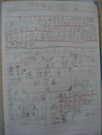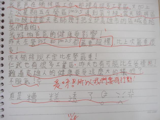國小學童在日誌中說害怕在楠梓工作的爸爸健康受影響,吶喊難道高雄人的健康要受這麼大的犧牲?(圖由地球公民基金會提供)