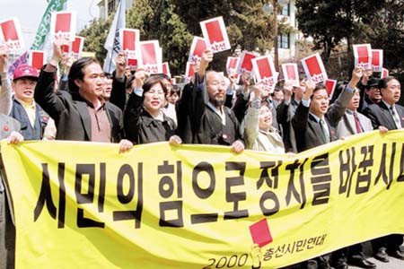 先是2000年1月12日,韓國460個市民團體結成「2000年總選舉市民連帯」(總選連帯)而在24日發表不適任候選人名單,先呼籲政黨不要提名,選定標準是不正腐敗的政治家、曾經違反選舉法、曾經參予軍事政變、對職務怠慢者、搧動地方對立者、主張讓漢字復活者等,大部分是跟軍方有關的人,當時也是想要撤廢加強統治管理的國家保安法;結果達讓102人中48人(47%)候選人從提名名單刪除;而在選戰部分,總選連帯重新發表86名落選候補名單,結果有59人落選,落選運動威力十足。