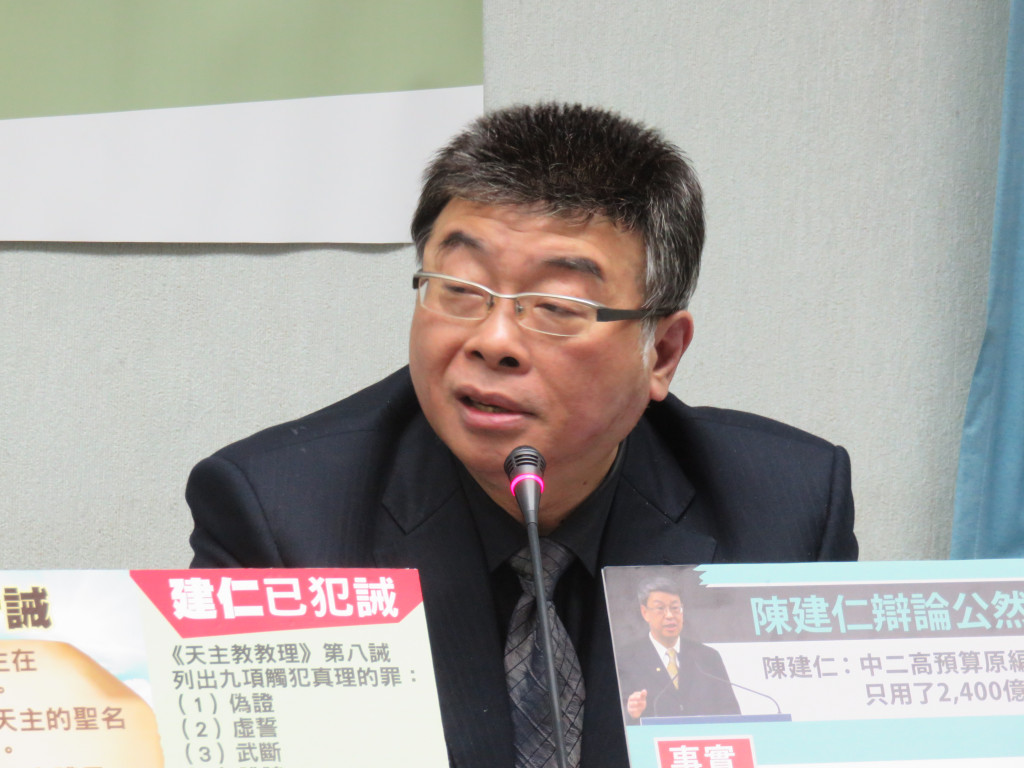 新黨不分區立委候選人邱毅、國民黨立院黨團副書記長、立委王育敏,以及國民黨文傳會主委林奕華今(30)日上午共同召開記者會「建仁兄,該告解了」,記者會中還準備了「十誡」等紙板道具,痛批陳建仁說謊,「已違反十誡」,應該要去告解,三人在會中不斷提及陳建仁的天主教徒身分。