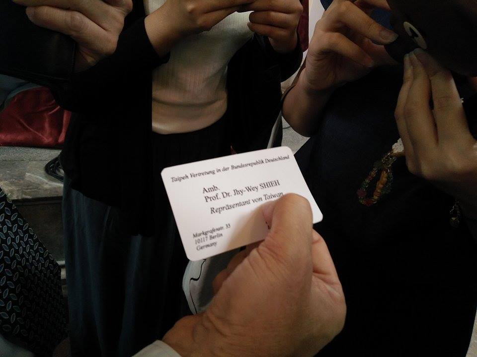 隨後,面對媒體跟他索取名片,謝志偉掏出名片,還特別翻到背後寫有德文處跟媒體說明,「這邊有台灣」。