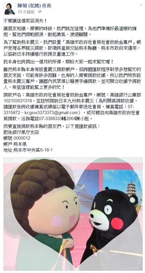 陳菊說,雖然熊本縣本身有設置震災捐款帳戶,但跨國匯款程序對很多想幫忙的朋友來說,可能有許多困難,也有的人需要捐款收據,所以我們特別設置熊本震災專戶,讓國內民眾得以簡便手續捐款,並可開立收據予捐款人,希望這樣能幫上更多的忙!」陳菊也在該貼文表示,她自己也將捐出一個月的所得,期盼大家一起來幫忙。