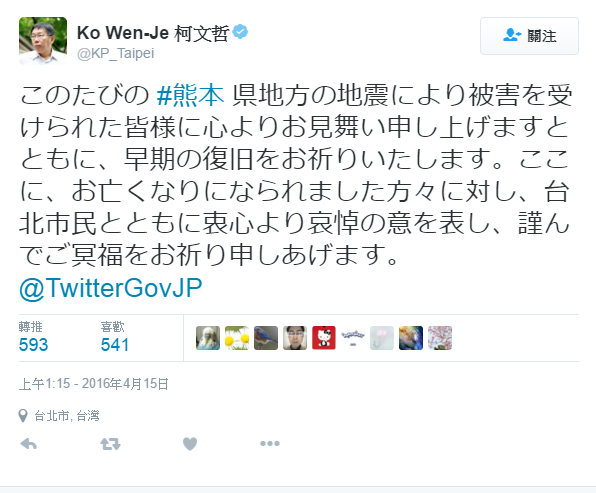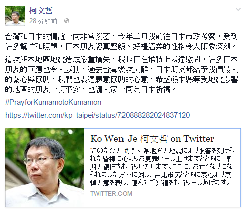 另外一方面,台北市長柯文哲今日也於臉書發文回應日本熊本地震。貼文寫道,「台灣和日本的情誼一向非常緊密,今年二月我前往日本市政考察,受到許多幫忙和照顧,日本朋友認真堅毅、好禮溫柔的性格令人印象深刻。」這次熊本地區地震造成嚴重損失,柯文哲也表示,自己昨日已在推特上表達慰問,許多日本朋友的回應也令人感動。