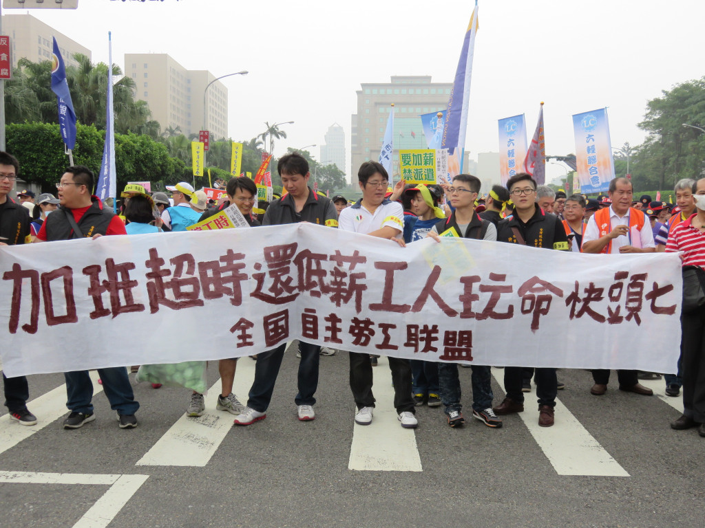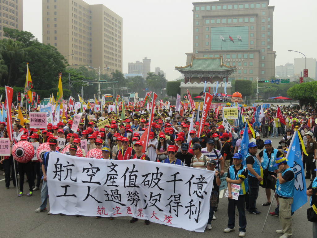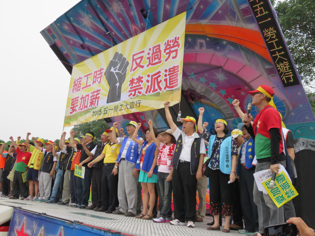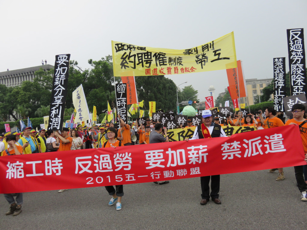 今天是五一勞動節,全國各工會、工運團體發起「2015五一遊行」,上萬名勞工下午在凱道集合,對著總統府投擲煙霧彈,抗議馬英九跛腳總統、看守政府,烏煙瘴氣的執政,齊聲怒喊「縮工時、反過勞、要加薪、禁派遣」,要讓馬英九聽見勞工的心聲。