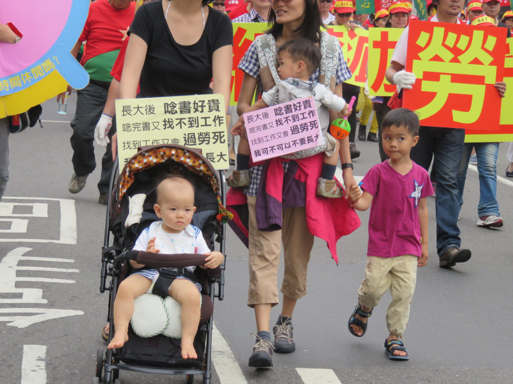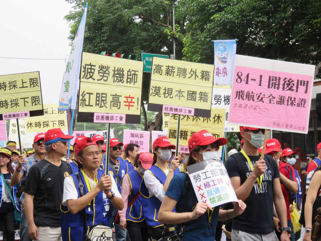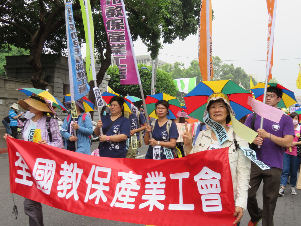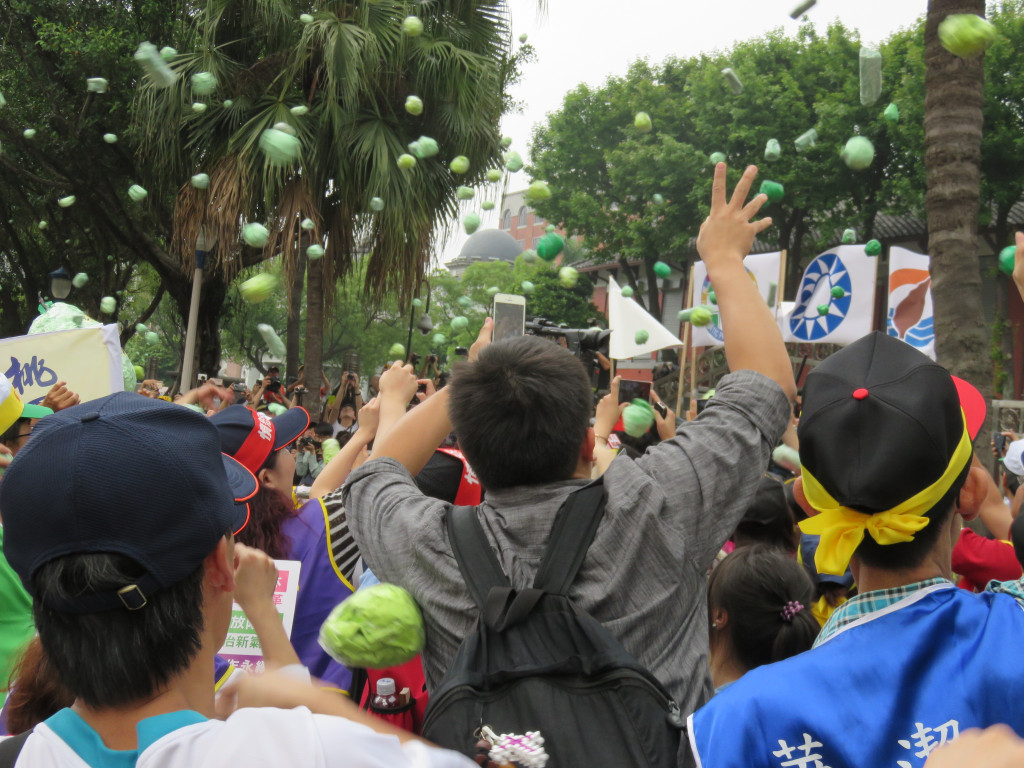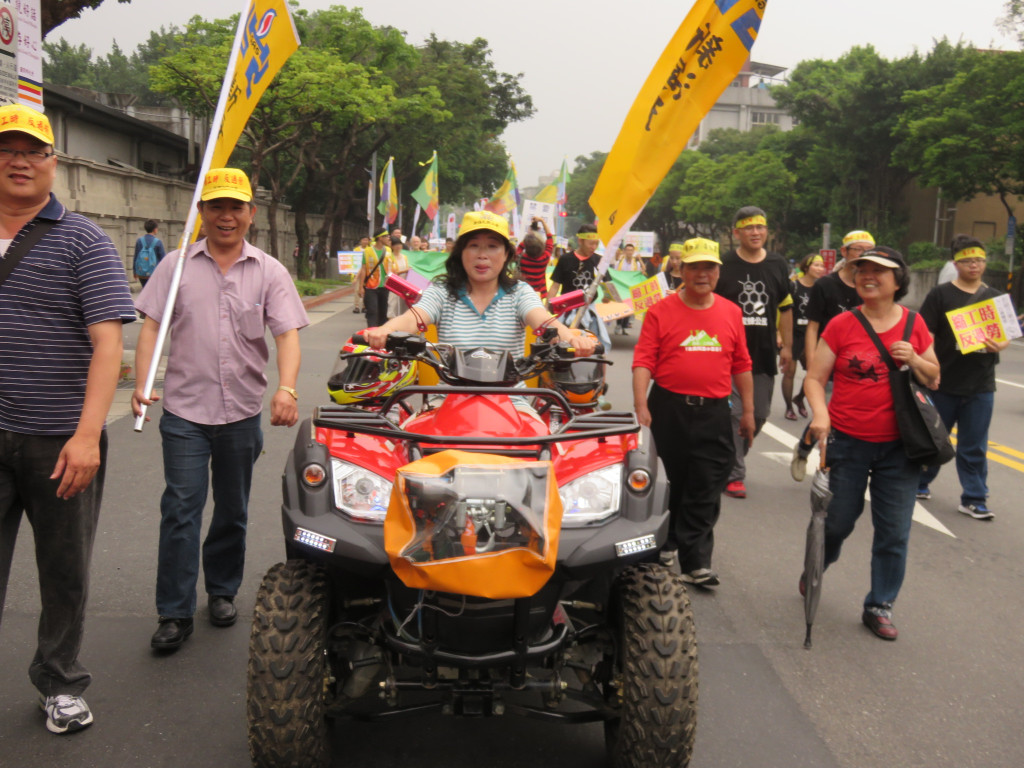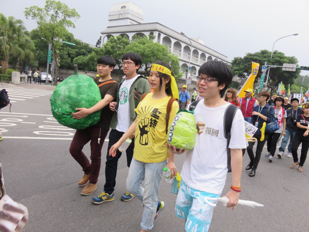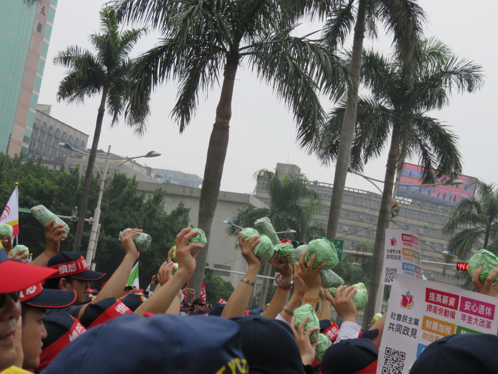 今年的遊行終點,衝著立法委員而來,五大隊往立法院集結,痛批各政黨亂開芭樂票,年年當選,對著立法院前中國國民黨、民進黨、台聯、親民黨的黨徽,怒丟芭樂,高喊「芭樂還你,加薪給我」!