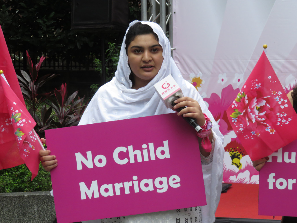 來自巴基斯坦的哈蒂康.巴希爾(Hadiqa Bashir)表示,在巴基斯坦的部落,童婚情況仍然非常嚴重。她有個朋友在11歲時就被強迫結婚,停止就學;她自己也在9歲時差點被迫嫁給計程車司機。因為親身遭遇,她決定挺身而出,發起「女孩團結爭取人權」的運動,對抗童婚,協助女孩重返校園接受教育。