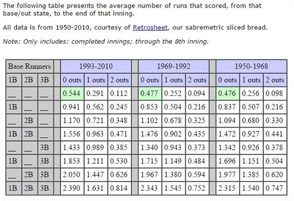 圖三 得分期望值矩陣表,壘上有人及出局數的各種狀況(base/out state)共24類,分別有不同的得分期望值。