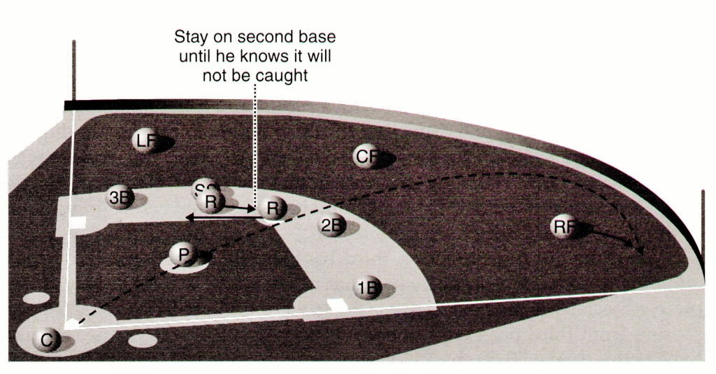 圖二 「跑者在二壘、1人出局、打者擊出可能遭到接殺的外野飛球」,跑者因應之道。 已1人出局,(圖二)也就是陽岱鋼當時的出局數。霍爾認為跑者應盡可能「遠離」二壘,但外野手接到該球時,也要能及時回踩二壘避免遭雙殺。在飛球降落之前,跑者在壘間停住腳步、重心保持平衡(不趨向二壘或三壘)。只要外野手「可能」接不到球,跑者都該「保持」離壘狀況;若外野手「無疑」可接獲該球,則先回二壘,再視情況是否前進三壘,基本前提是絕不能讓第3個出局數發生在三壘而結束該局。