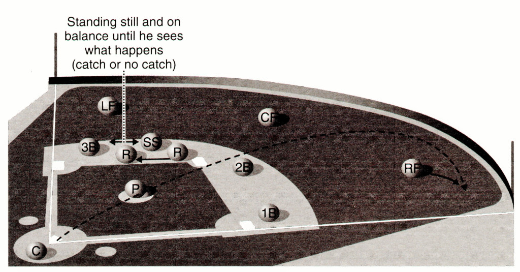 無人出局時。(圖一)跑者應先回踩二壘。若確定外野手接不到飛球,則開始跑向三壘,是否衝本壘,以回傳球遠近而定;倘該球可被接到,則視情況盡可能前進到三壘,形成1出局、三壘有人,利於得分的好時機。