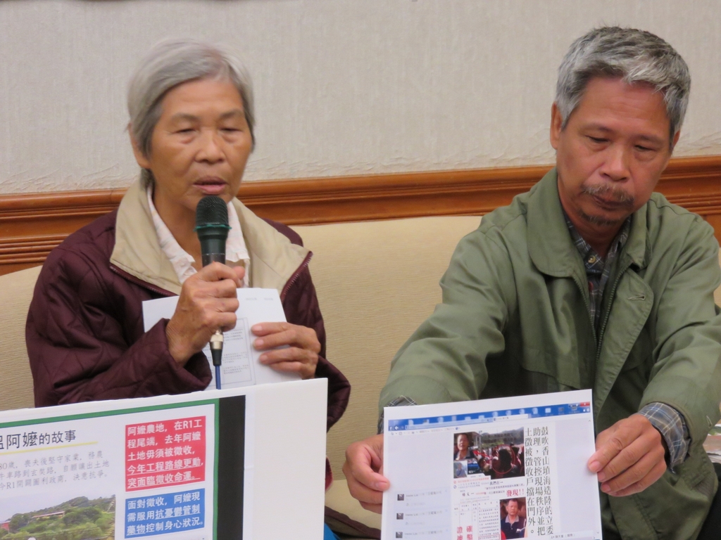 (R1道路被徵收戶溫瑞香(左)及陳文賢,控訴遭暴力強徵、潑漆恐嚇的遭遇/記者林冠妙攝)