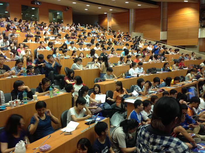 (當黃國昌遇上郝毅博,現場觀眾擠爆會場,連前排地上都坐滿人/張龍僑攝)