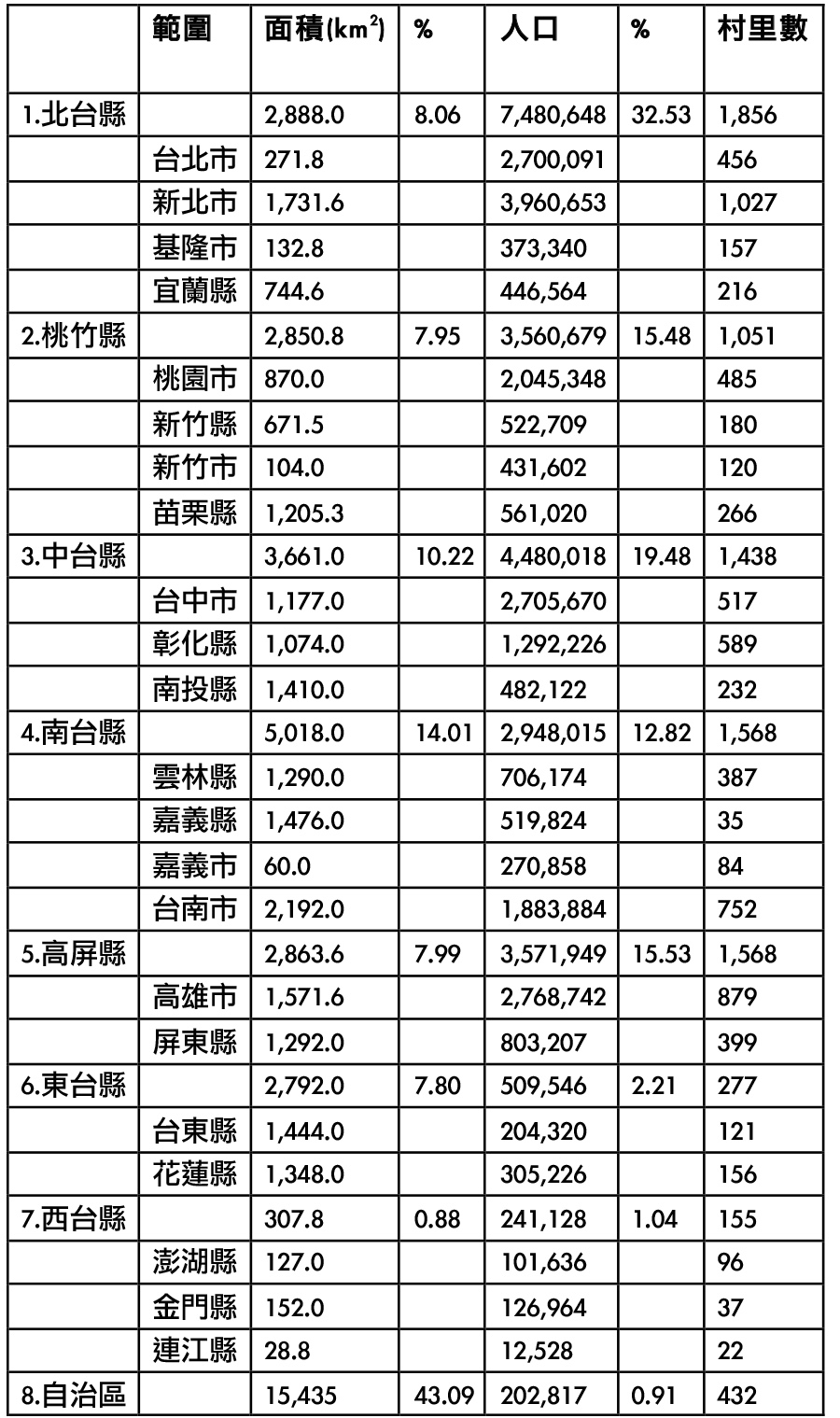 此即是資源、環境、參與、治理等四大意涵。經審慎評估之後,將全台重劃為八區域 (北北基宜、桃竹苗、中彰投、雲嘉南、高屏、花東、澎金馬及原住民自治區) 。 比照現行直轄市功能和編組,統稱為縣(或自治區) ,計有北台縣、桃竹縣、中台縣、南台縣、高屏縣、東台(花東)縣、西台(離島)縣和自治區等8個行政區。