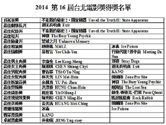 本屆台北電影節完整得獎名單如下: